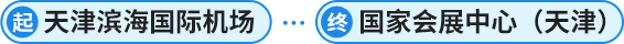 滨海国际机场站(乘坐地铁2号线曹庄方向)→屿东城站(转乘10号线于台方向)→财经大学地铁站(转乘1号线双桥河方向)→国家会展中心地铁站