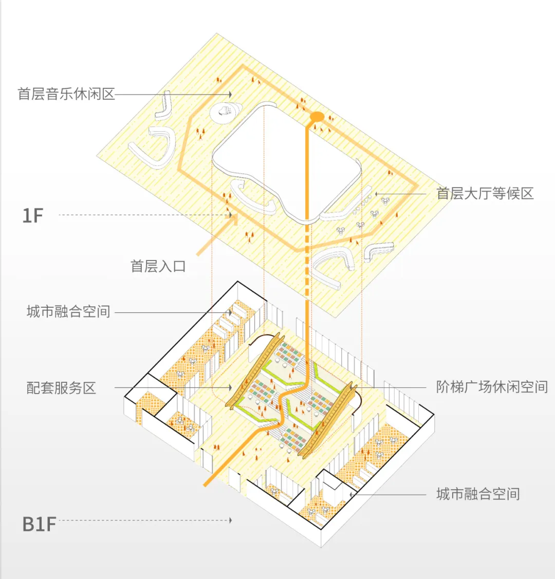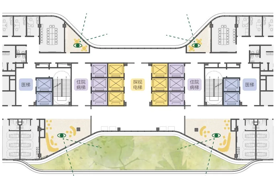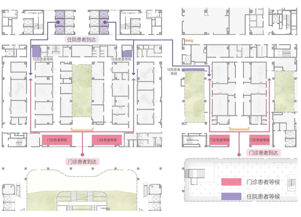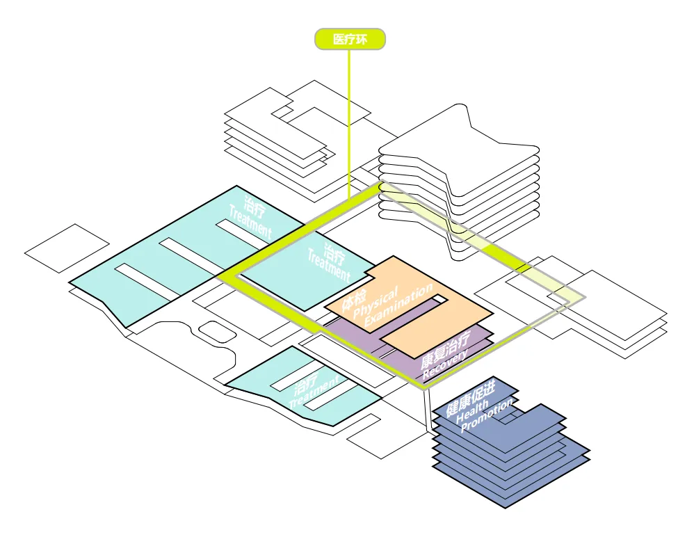 This design integrates ancillary medical support functions into the transitional spaces where the building meets the urban fabric. By doing so, it not only enriches the architectural program but also mirrors essential city functions within the hospital grounds. This approach provides convenience for patients while surrounding them with familiar daily life scenarios, helping to normalize the healthcare environment.