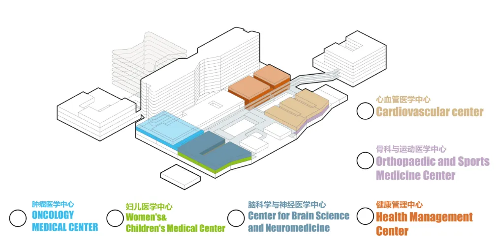 The medical planning follows a one-stop, disease-centered diagnosis and treatment concept. Under a vertically-integrated multi-center model layout, the hospital focuses on building six major Centers of Excellence: the Oncology Medical Center, Orthopedics and Sports Medicine Center, Brain Science and Neurology Center, Women and Children's Medical Center, Cardiovascular Center, and Health Management Center. The one-stop layout design shortens patient travel distances within the hospital and maximizes convenience for patients.