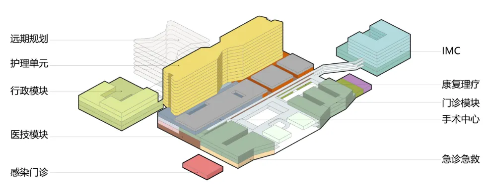Looking ahead, this T-shaped spine can be extended into a loop layout to meet long-term growth needs, achieving a closed-loop functional system. The future establishment of a Translational Medicine Center will further drive the hospital’s comprehensive development across clinical care, education, research, industry, and innovation, aligning perfectly with the institution's strategic positioning.