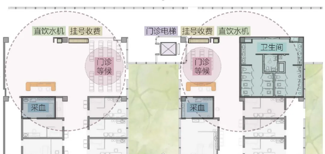 Centralized Functional Nodes: On the floor plan, clinical functions are clustered around patient zones. Waiting areas are integrated with immediate support services—such as registration, payment counters, blood collection rooms, restrooms, and water stations—to provide a seamless service experience.