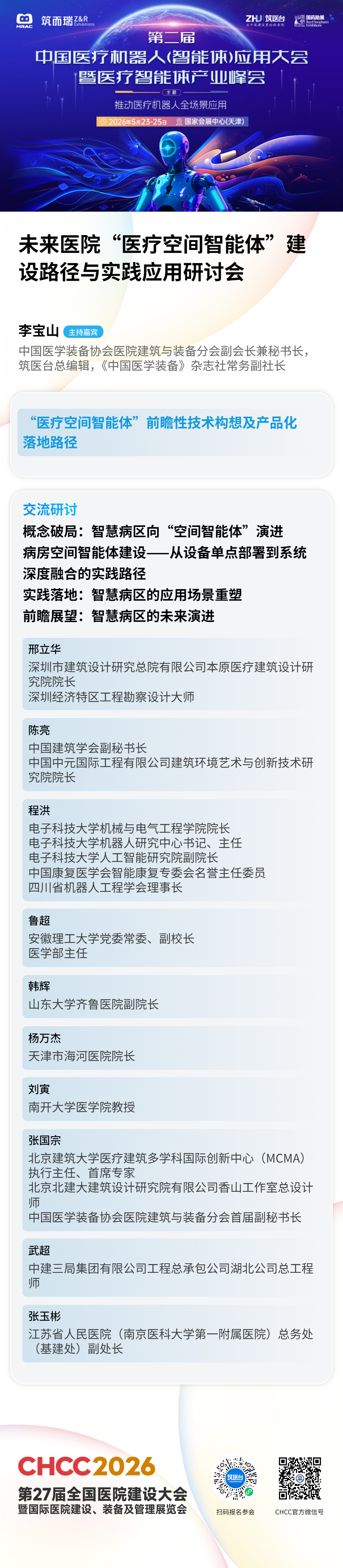 如果你还在雾里看花,不如来这里深度交流、共同探索!CHCC2026 第 27 届全国医院建设大会同期,第二届中国医疗机器人(智能体)应用大会暨医疗智能体产业峰会,特别策划未来医院 “医疗空间智能体” 建设路径与实践应用研讨会!5 月 23-25 日,国家会展中心(天津),带你从概念到落地,一步步看清医疗空间智能体的未来模样!